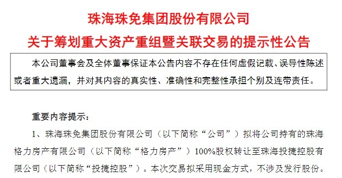 10月22日,珠免集团披露《关于筹划重大资产重组暨关联交易的提示性公告》,拟将持有的珠海格力房产有限公司100%股权转让至珠海投捷控股有限公司,本次交易以现金方式配查信配资,不涉及发行股份。